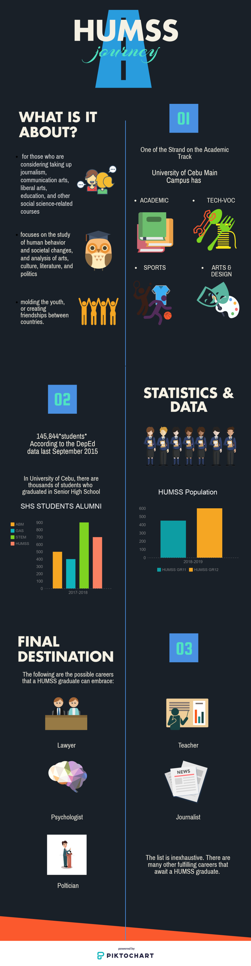 HUMSS stands for Humanities and Social Sciences. This track focuses on the study of human behavior and societal changes, and analysis of arts, culture, literature, and politics. It involves political science, anthropology, linguistic, psychology, and communication.